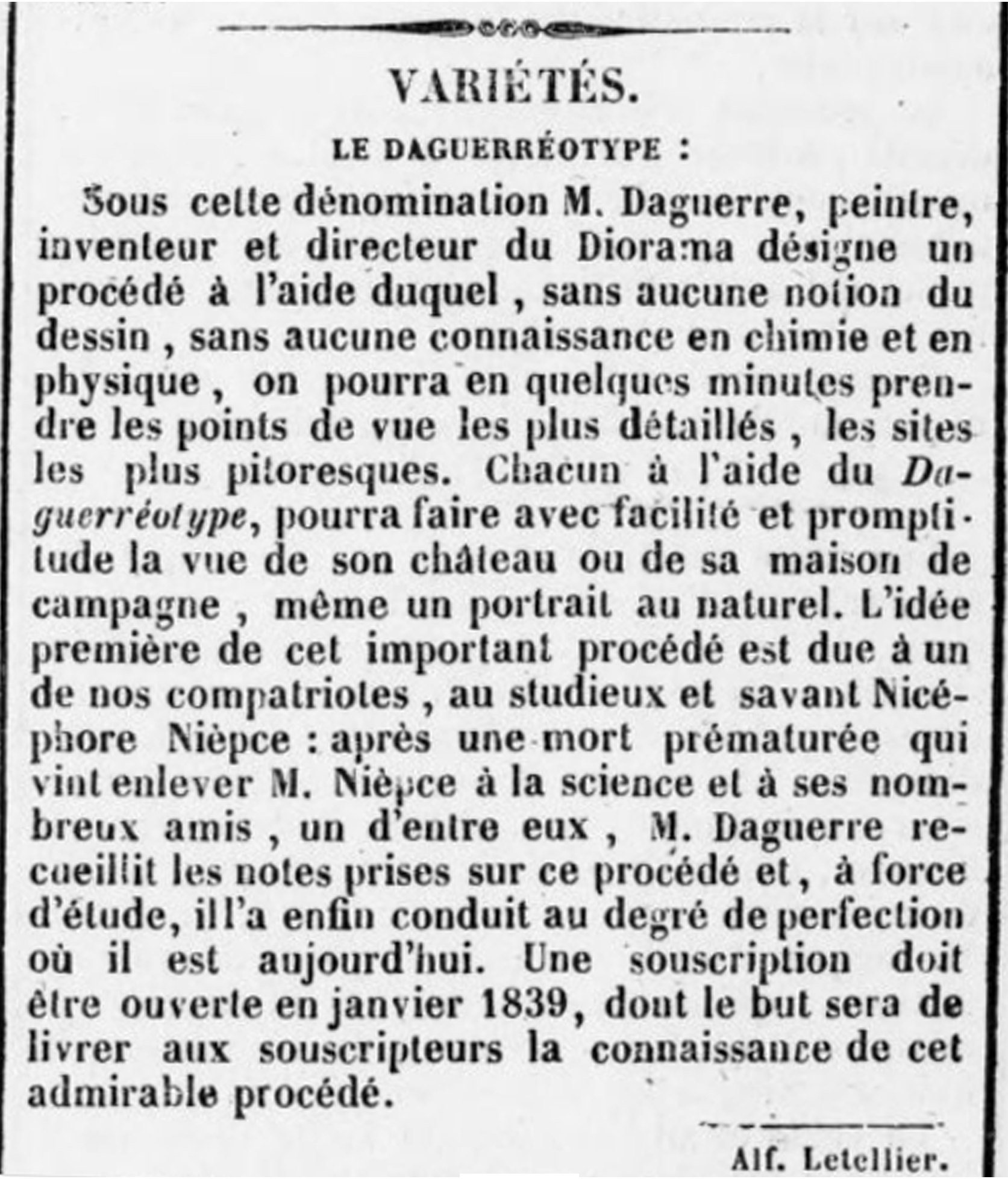 1839, 2 January Announcement of the Daguerreotype in the French newspaper Le Drapeau Tricolore, 2 January 2022