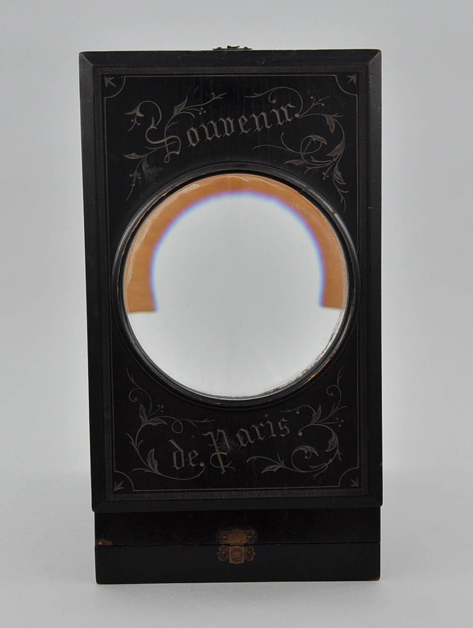 Graphoscope with lens folding into a box, with a moving fretted easel and adjustable viewing angle, adjustable picture cradle. Made of wood with lacquer finish and decorative carving 'Souvenir de Paris' on the front.