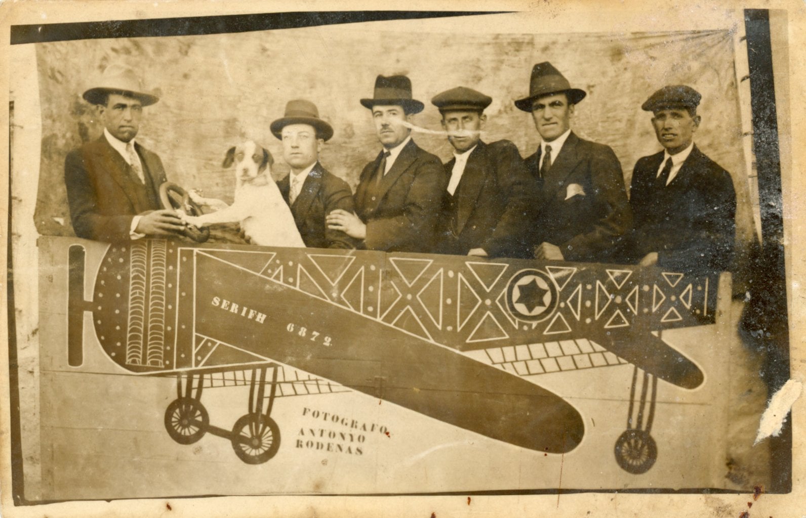 Six men and a dog with a aeroplane foreground, Spain