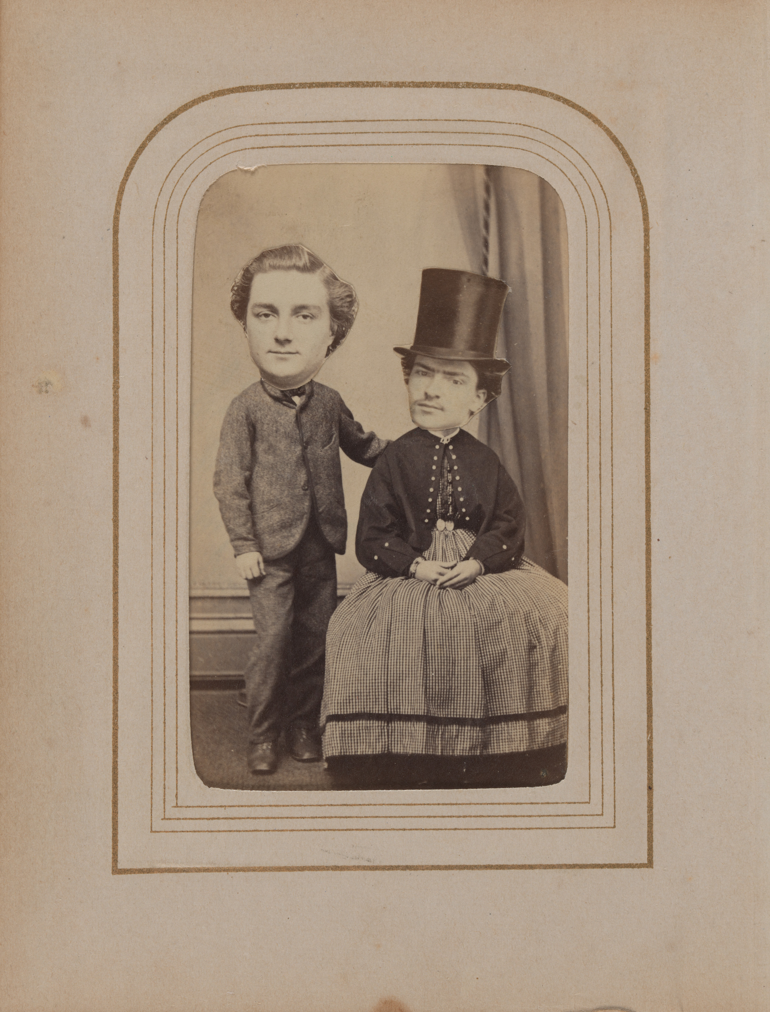Beginning in the late 1850s, cartes de visite, or small photographic portrait cards, were produced on a scale that put photography in the hands of the masses. Ahead of its time, this unusual collection of collages spoofs the rigidity of the format. The images play with scale and gender by juxtaposing cutout heads and mismatched sitters, thereby highlighting the difference between social identity—which was communicated in part through the exchange of calling cards—and individuality.