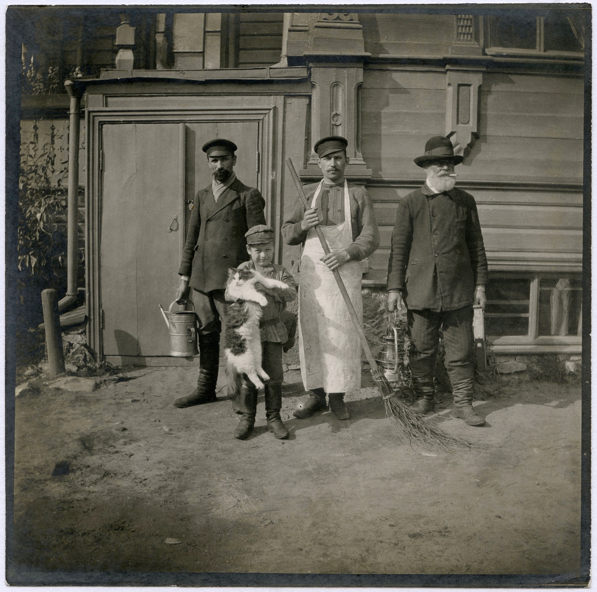 Boy with a cat, janitor with a broom, gardener with a watering can and watchman with a lantern and a beater [Russia]