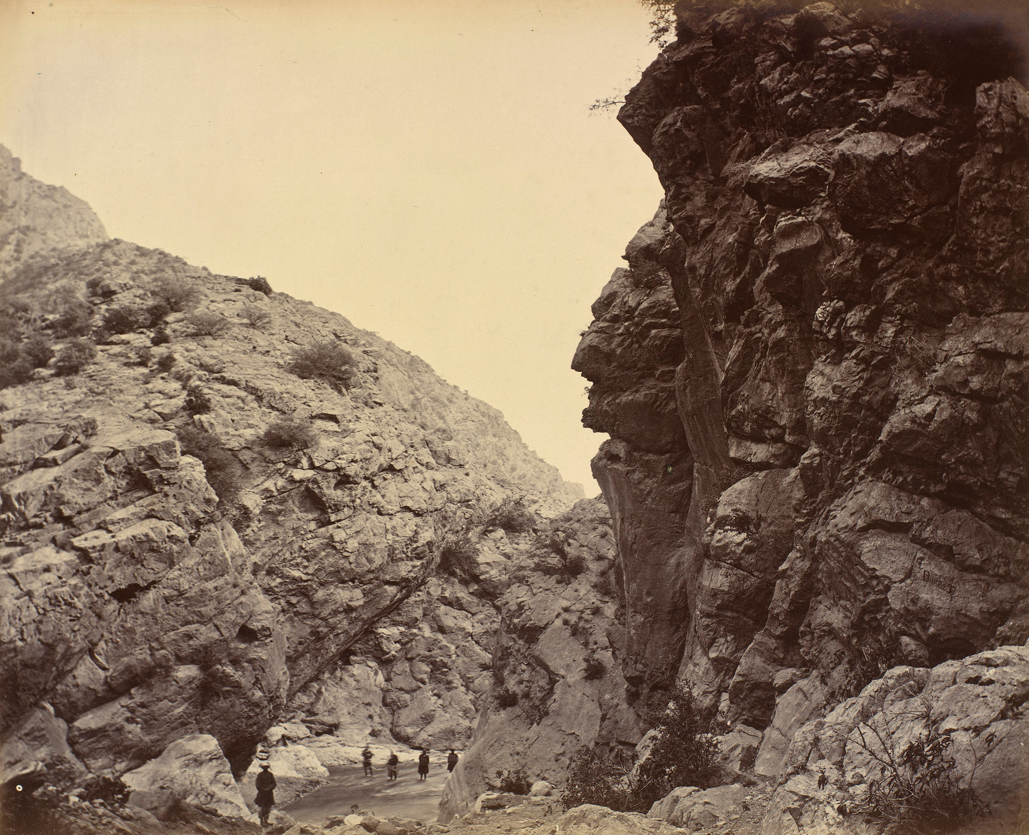 Photograph of the gorge through the Khyber Pass, beyond the Fort of Ali Masjid. A river is running through the gorge with steep rocky mountains to either side. Four men are standing in the water and a man wearing a turban is standing on a rock in the foreground. The photographer John Burke travelled with the Peshawar Valley Field Force during the Second Anglo-Afghan War (1878-80), one of a series of conflicts between Britain and Russia over control of Afghanistan. His images from the war capture landscapes, key strategic sites and soldiers involved in the conflict.