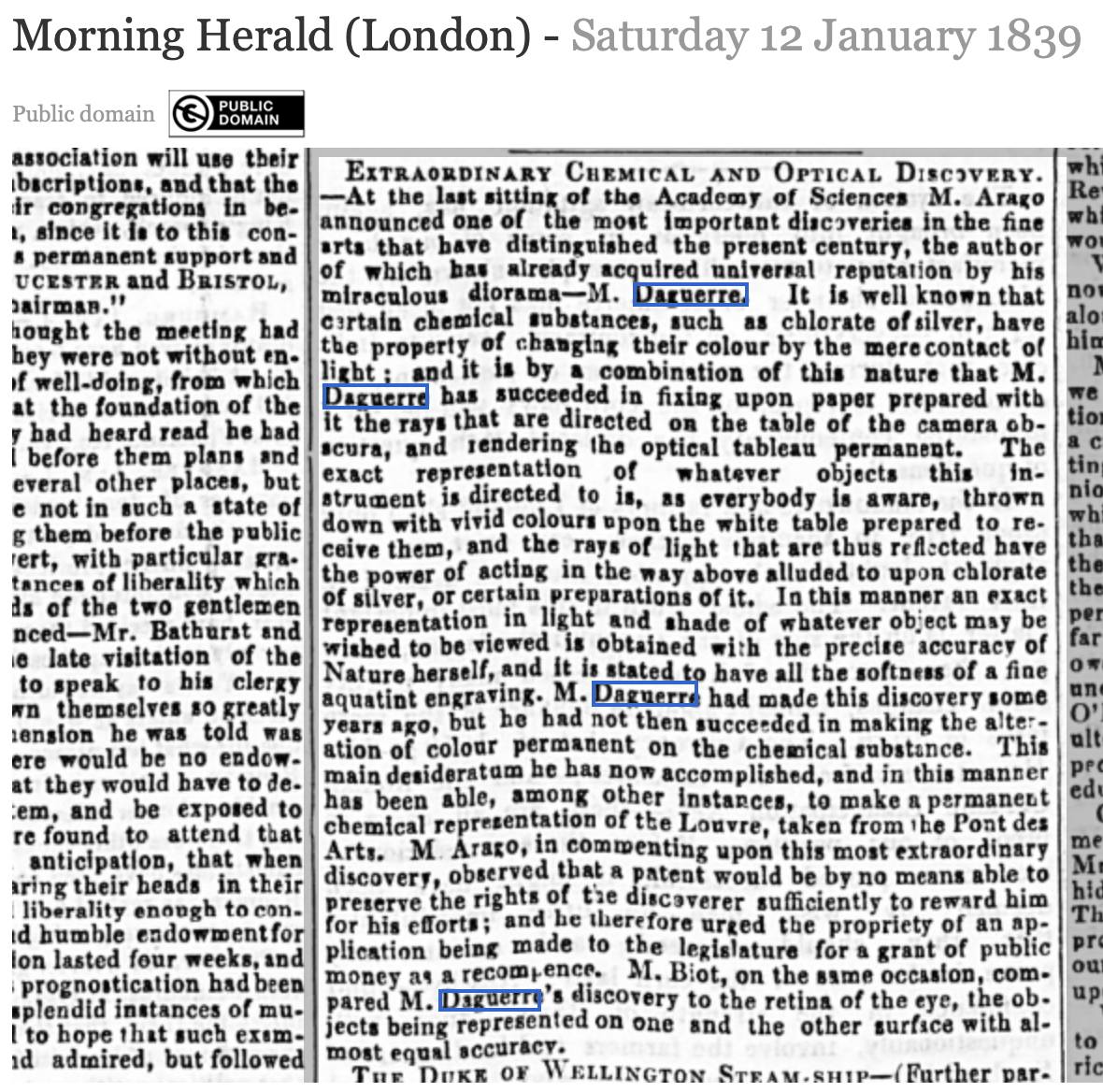 1839, 12 January Announcement of an "Extraordinary Chemical and Optical Discovery" in the British newspaper Morning Herald (London). Saturday 12 January 1839