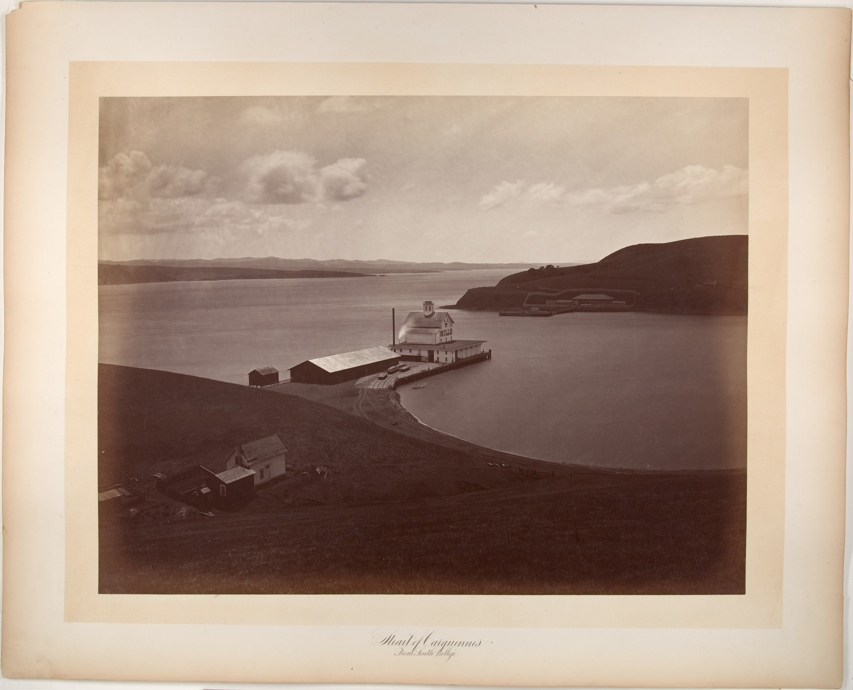 When Watkins exhibited his mammoth prints in 1869, a critic remarked, "They justly deserve the encomiums passed upon them. For clearness, strength, and softness of tone, these picturesque views are unexcelled; and while they present truthful representations of the scene chosen, they are an earnest of the artistic skill of the photographer." The site of this photograph (known today as the Carquinez Strait) is a narrow, tidal body of water twenty miles inland from the mouth of San Francisco Bay. Part of a busy, deep-water shipping channel to Sacramento, the strait (and the surrounding shoreland) is still beloved for its extraordinary beauty and diversity of wildlife and flora. The Star Flour Mills (center) is featured by Robert Louis Stevenson in The Silverado Squatters (1883), his prescient travelogue about the California wine country of Napa Valley. Stevenson's account of his 1880 honeymoon discusses his journey from San Francisco to Calistoga and Mount Saint Helena, where he and his new wife and stepson lived for two months as "squatters" in the bunkhouse of an abandoned mining camp.
