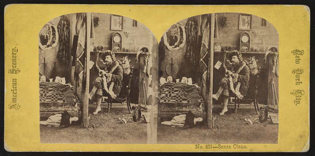 Photograph shows Santa Claus with a basket of presents on his back watching two children sleeping.
