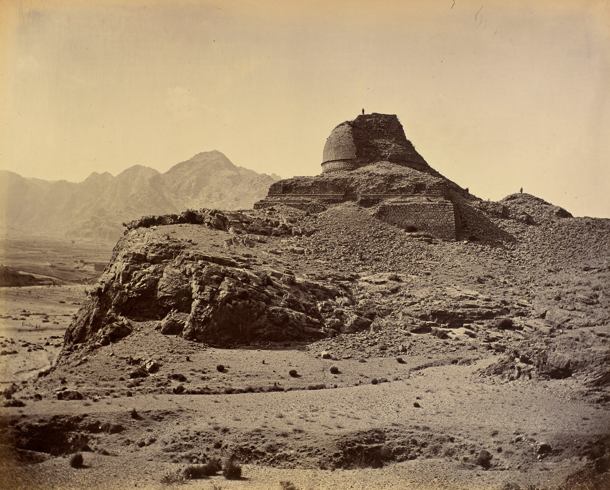 Photograph of the Buddhist monument Sphola Stupa in the Khyber Pass. The monument is on a high rocky ledge and consists of a stone mound supported by a tiered base. Large sections of the stone have fallen away, particularly to the right of the mound. A man is standing on the top of the mound, and another man is standing on a pile of rubble to the right. There is a valley beyond with steep mountains rising behind it. The photographer John Burke travelled with the Peshawar Valley Field Force during the Second Anglo-Afghan War (1878-80), one of a series of conflicts between Britain and Russia over control of Afghanistan. His images from the war capture landscapes, key strategic sites and soldiers involved in the conflict.