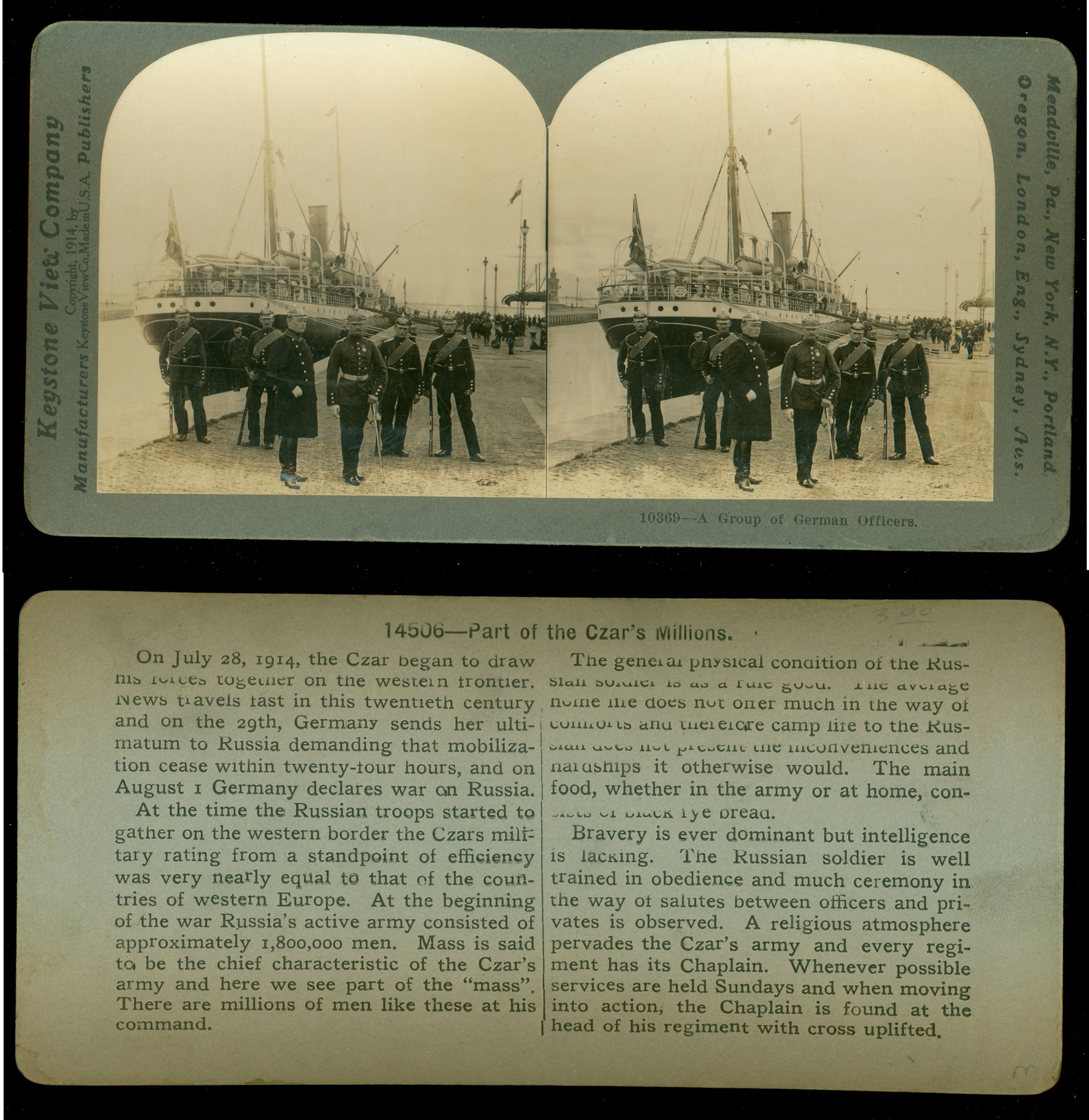 Stereocard, front and back Private collection of Ralph Reiley (Ralph Reiley, 14 July 2021) Here is a curious photo from Keystone's first World War group of views that is wrong on several levels. First, on the front it is Keystone 10369, A group of German officers. On the back it is Keystone 14506 Part of the Czar's millions, with text about a large group of Russian soldiers. A miss-matched front and rear of the stereo views. The German officers are really one policeman, one officer and four enlisted men from 1901 during the Boxer Rebellion, not WW1 as implied. The rear of the card is also a recycled photo, from the Russo-Japanese war of 1905, not 1914 as indicated by the date on the front.