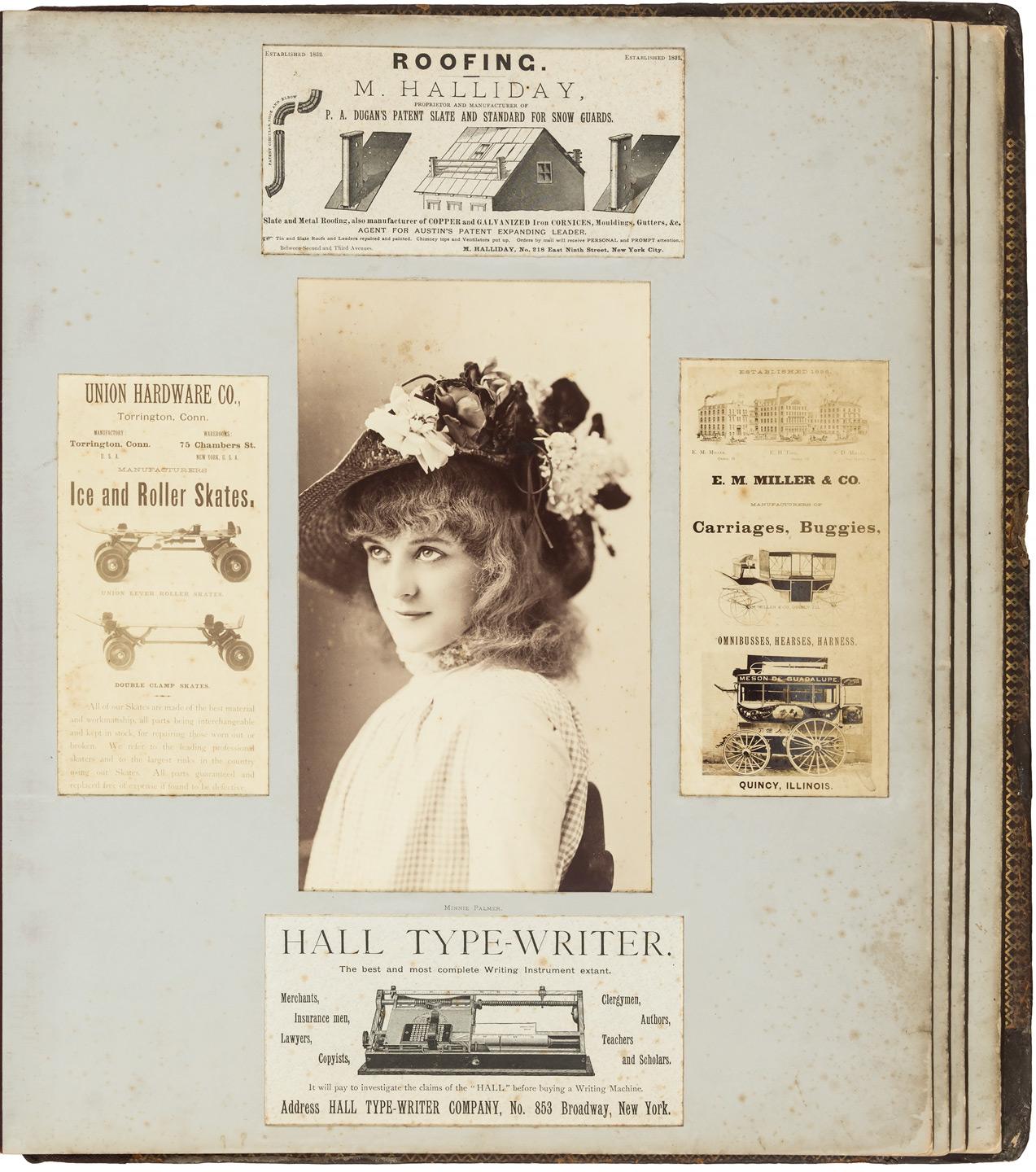 This monumental volume was created by the prominent New York photographer, Napoleon Sarony. Each side of the 23 thick board pages contains a matted albumen photograph and four matted advertising cards. Of the photographs, 42 are large portraits of notable actresses. Portraits of Grover Cleveland and his Vice President, a portrait of the celebrated coronet player Liberati, and a photograph of the Owen paper-making establishment (possibly the producer of this album) are also included. Of the 184 advertisements, 91 are photographs, the others are either engraved, lithographed, or chromolithographed. The large photographs measure 11½ x 6¾ inches (292 x 171 mm.), while the advertisements are mostly 8 x 4 inches (203 x 102 mm.) or the reverse. Produced to sit in the lobby or bar of pre-eminent hotels, art albums were a kind of concierge service, created to entertain and inform visitors of the businesses and pleasures associated with these exclusive establishments. This album is filled with seductive portraits of the stars of the Belle Epoque, including Fannie Davenport, Adelina Patti, Lilly Langtry, Ada Rehan, Lotta Crabtree, Modjeska, Ellen Terry, and Lillian Russell, plus dozens of advertisements for goods and services. All were posed and photographed by the greatest photographer of the American theater, Napoleon Sarony (1821-1896). He established a studio on Broadway in New York in 1866 and for the next thirty years Sarony photographed virtually every actor and actress working on the New York Stage. The Hoffman House was located on Broadway between 24th Street and 25th Street. Built in 1864, it quickly became the informal meeting place for the Democratic Party in New York. Grover Cleveland stopped there frequently, and was living there when he was elected to the Presidency for his second term. General Benjamin Butler and General Winfield Scott made the hotel their home on several occasions, and William Randolph Hearst lived at the Hoffman when he first came to New York City. Edward S. Stokes, who shot financier James Fisk, Jr., became a partner in the hotel, serving as general manager until 1897. The elegant barroom with its shocking painting Nymphs and Satyrs by Bougereau, became a major tourist attraction. Due to their large size and small number, hotel art albums" rarely survived. We have located two others in public institutions. One for the Parker House of Boston is at Brown University, and the other for the Ponce De Leon Hotel of Saint Augustine, Florida is at Jacksonville University.