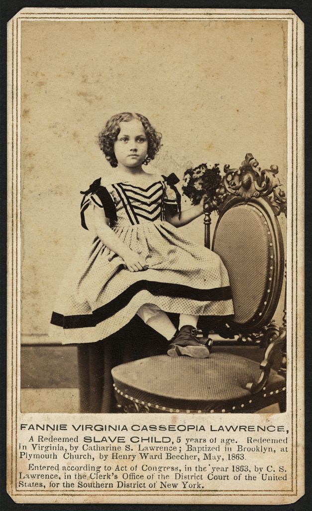 Caption below image: "A redeemed slave child, 5 years of age. Redeemed in Virginia, by Catharine S. Lawrence; Baptized in Brooklyn, at Plymouth Church, by Henry Ward Beecher, May, 1863".