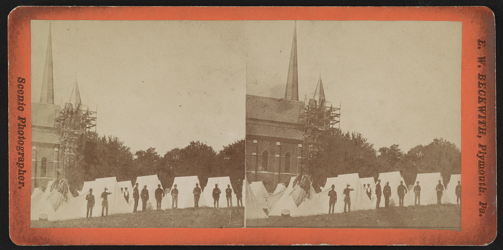 Photograph shows members of the 18th Regiment Infantry of the National Guard of Pennsylvania standing outside of assembled tents.