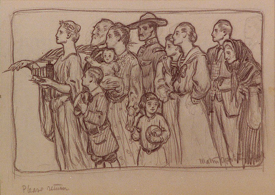 Woman in classical garb with palm leading emigrants