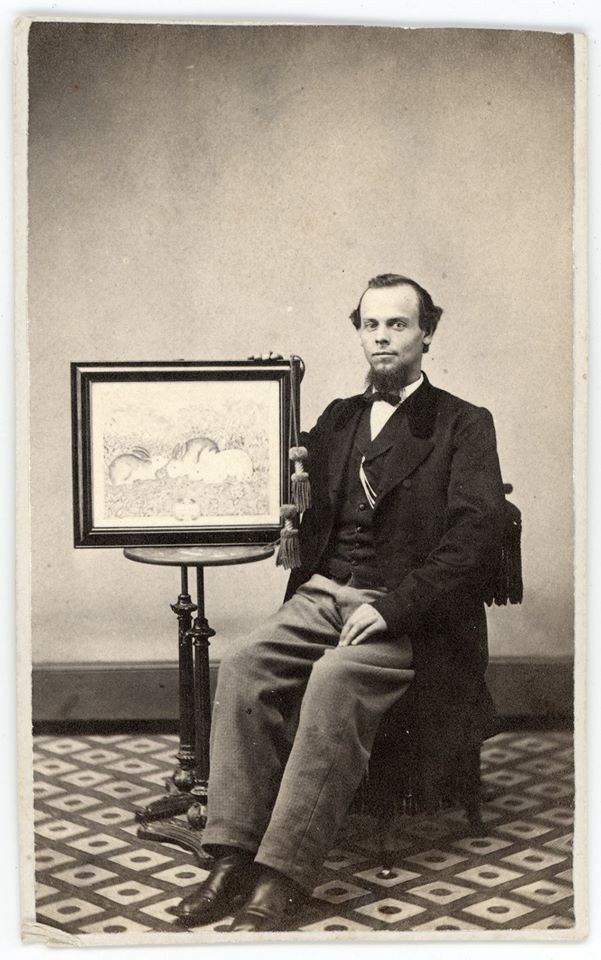 (Ron Coddington, 11 April 2020) Rabbit iconography has been a subject for artists from ancient times to the present. Egyptian hieroglyphs. Roman mosaics. Medieval manuscripts. Oil paintings and engravings by master artists. This man posed with a framed study of three rabbits, possibly a lithograph, continues the long and ongoing tradition. Judging from the expression of satisfaction and pride on his face, he is the artist. A tax stamp on the back of the mount dates this photograph between 1864-1866.