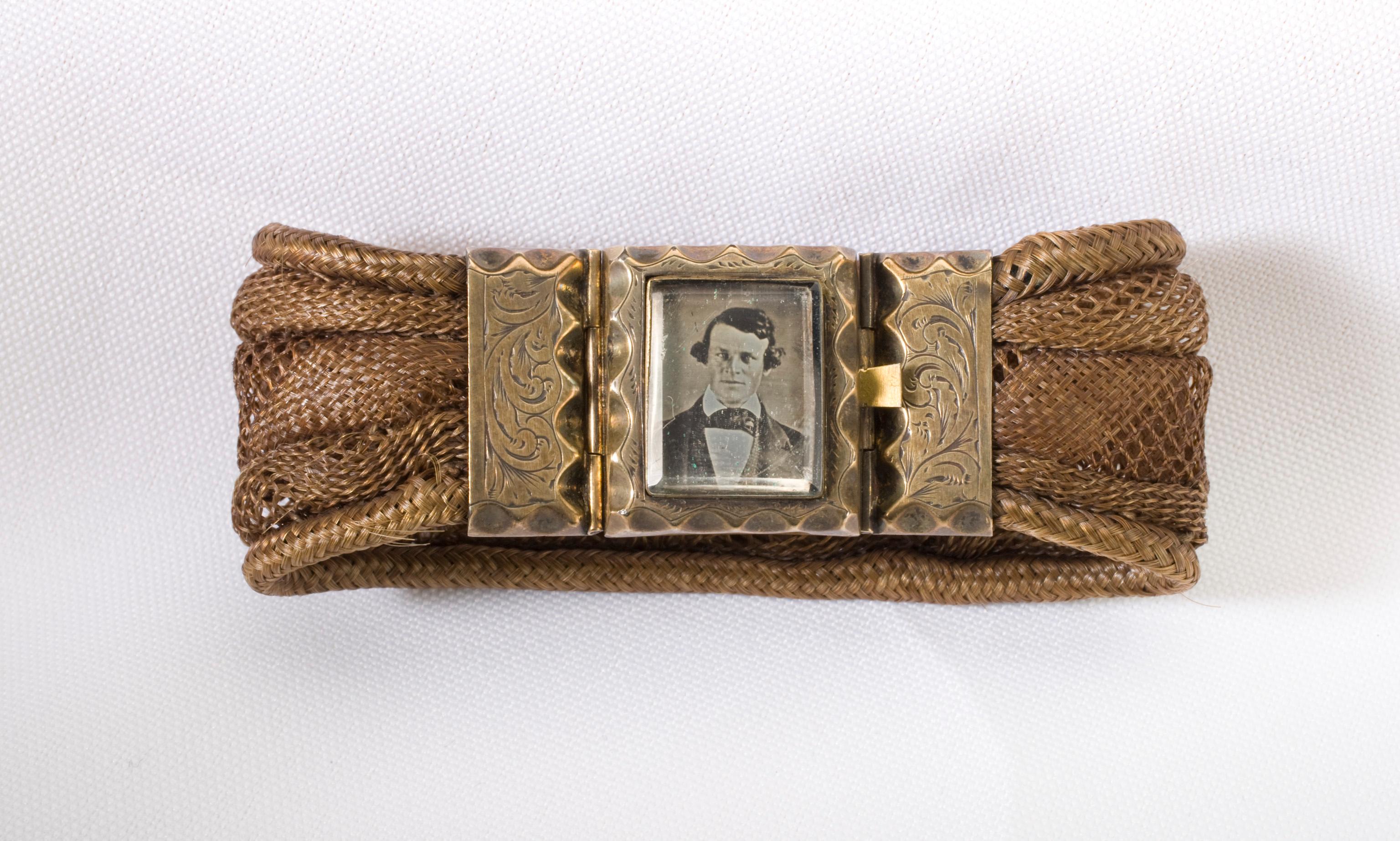 Human hair woven bracelet with small daguerreotype portrait of unidentified man