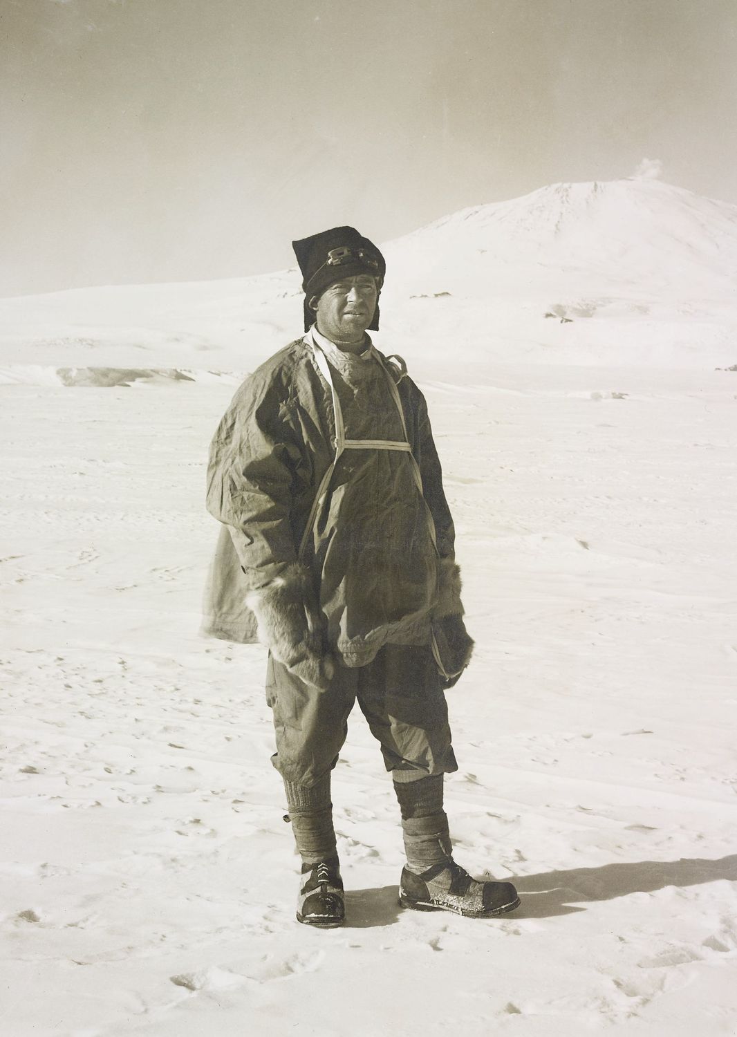 Photograph of Captain Robert Falcon Scott (1868-1912), standing in front of the Erebus volcano, taken before initial depot-laying journey to the Great Barrier.