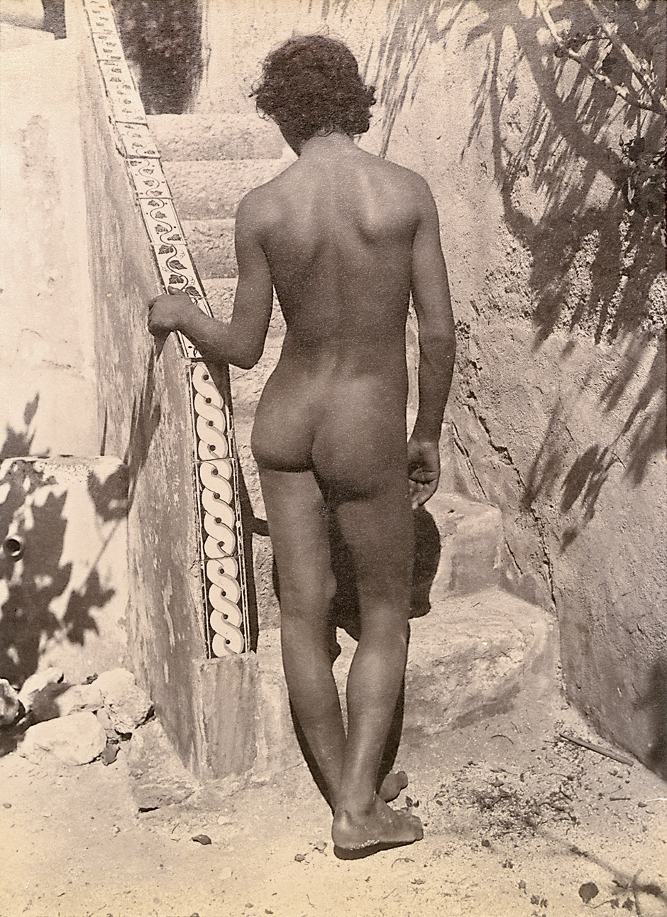 Many of von Gloeden's prints, such as this one, were distributed in Germany and France. This print has the stamp of the distributor B. Bloch, Vienna on the verso. It is a beautifully composed image following in the tradtion of the artist study. - One small retouched spot in mid area, minimal fading in lower edge, otherwise a strong print in very good condition.