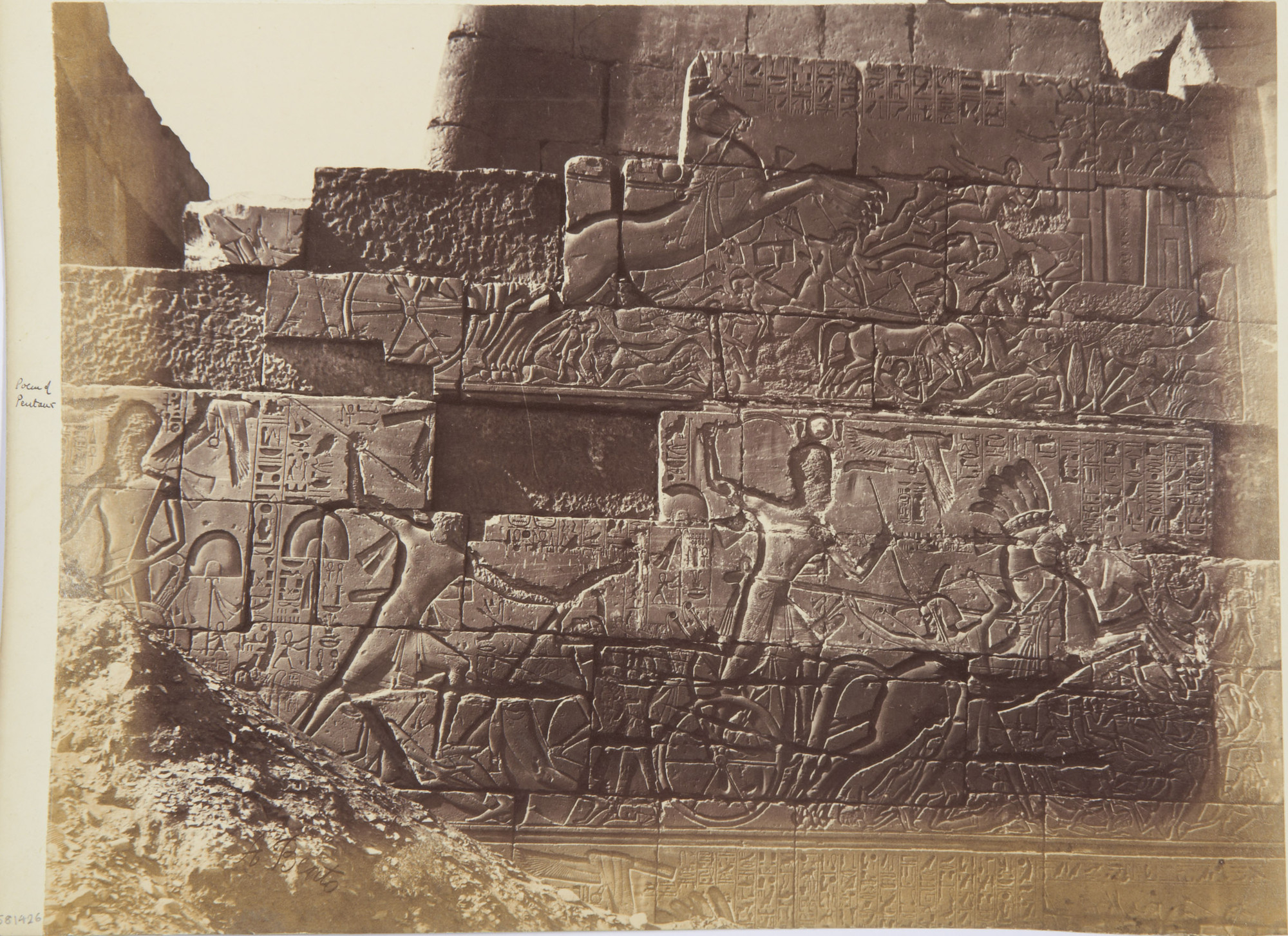 Photograph of a close up section of a temple wall, covered in bas reliefs and carvings of battle scenes, with men in chariots, depicting the Poem of Pentaur, within the temple complex of Karnak