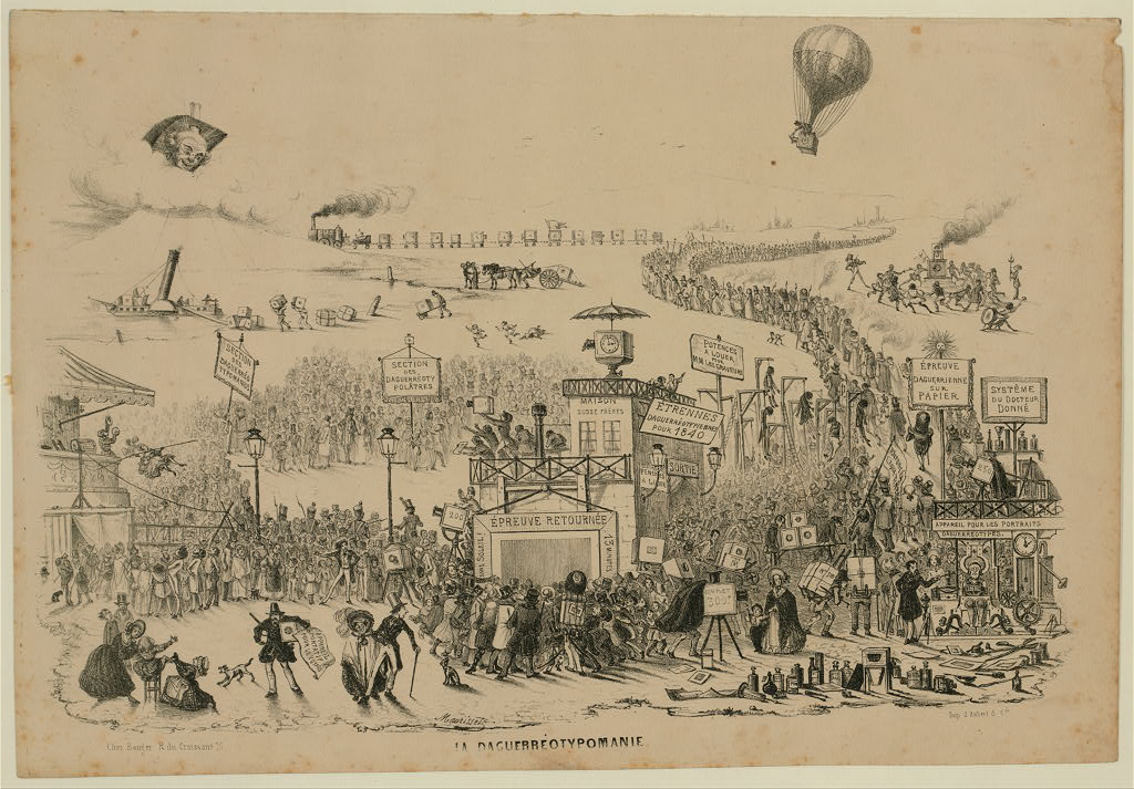 Library of Congress description: "French cartoon about the rush to try photography after Louis Jacques Mandé Daguerre revealed his process in 1839. Print shows long lines of people waiting to be photographed and others eager to support the craze by providing training and a vast array of photographic equipment. Several men hanging from gallows, "Potences a louer pour MM les graveurs," represent the death of art in the birth of photography. A balloon hovers in the air with a large camera as its basket."
