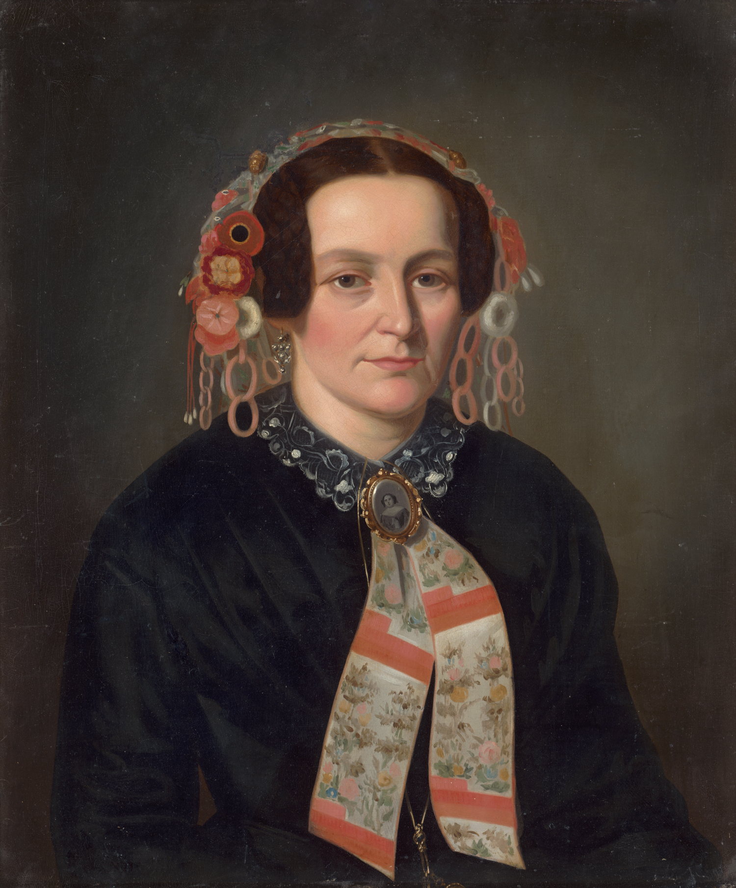 Portrait of a woman with embroidered bonnet, lace collar and miniature medallion.