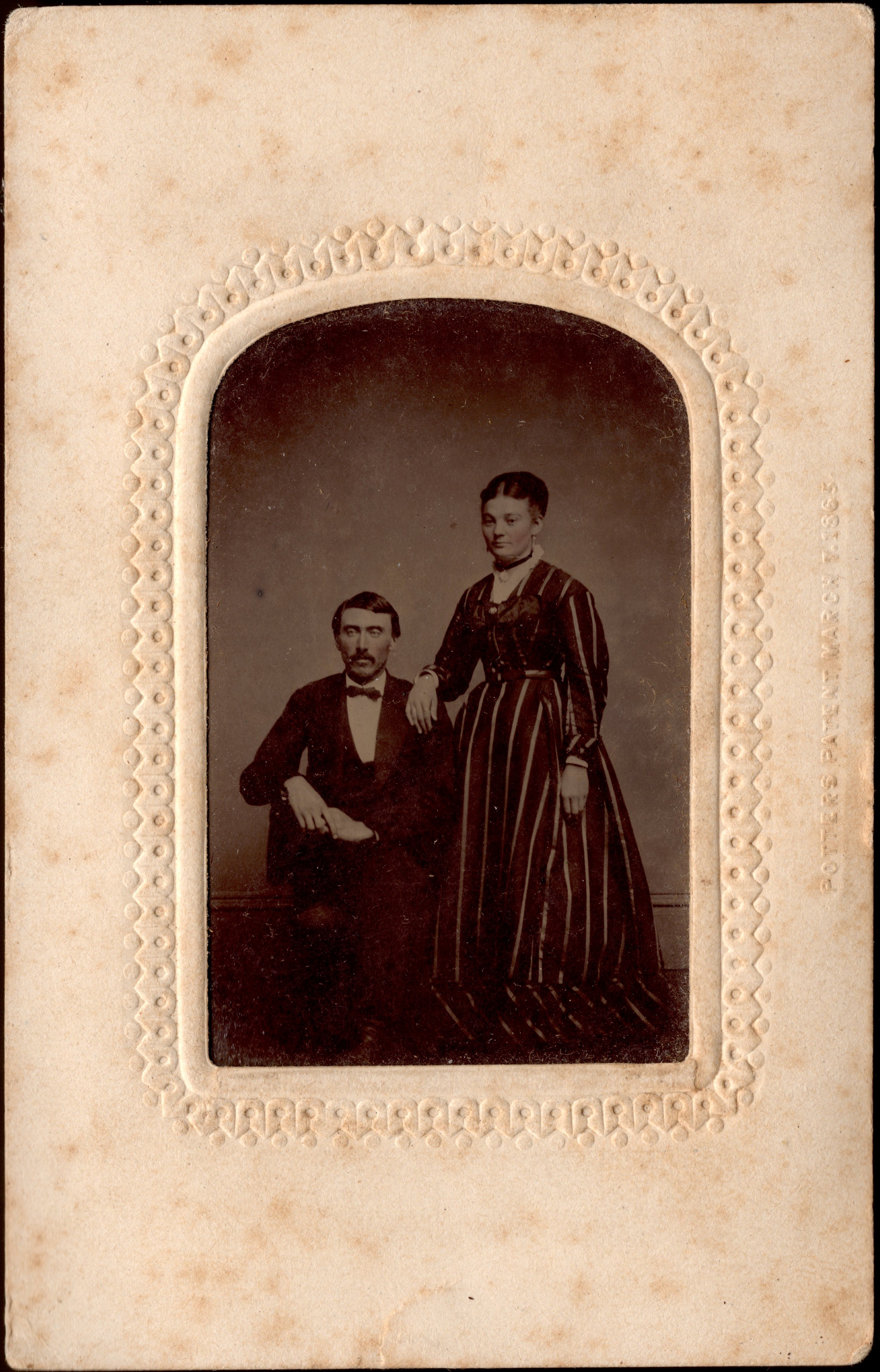 Portrait of a seated man and a standing woman in a "Potters Patent March 7 1865." tintype card mount