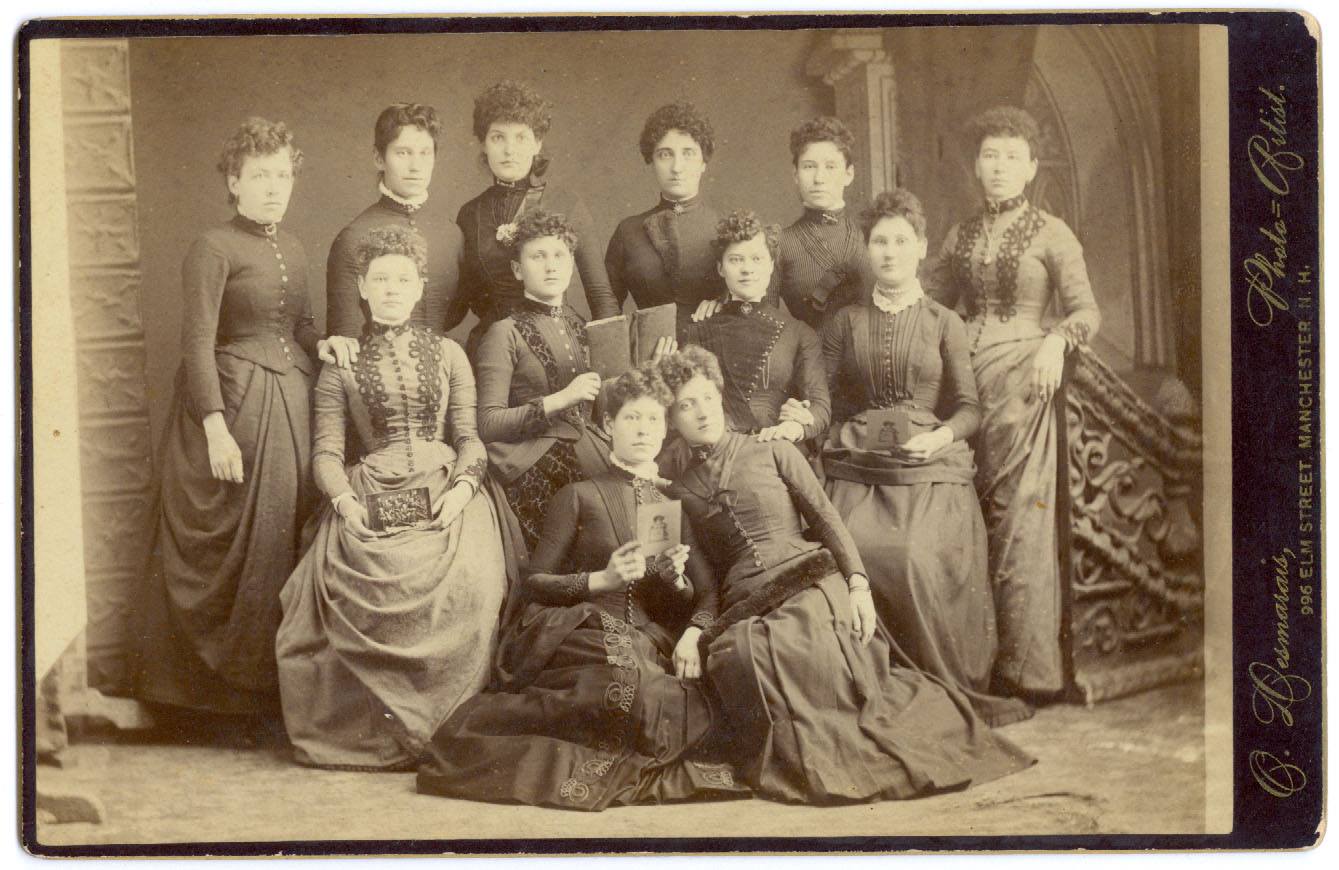 Portrait of a group of twelve woman some holding cabinet cards