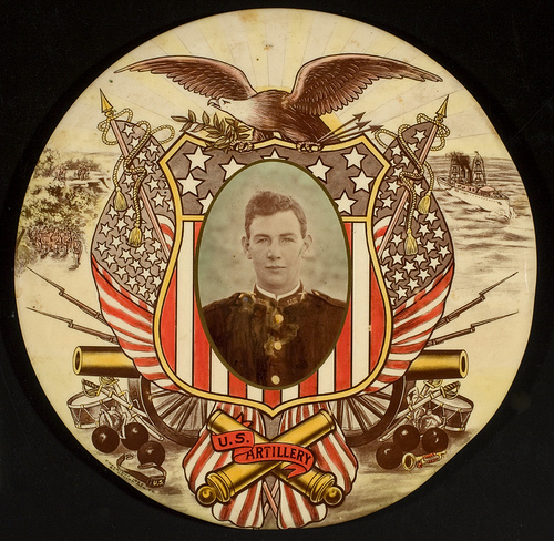 Gelatin silver print (POP) with applied color and chromolithograph, mounted on celluloid medallion