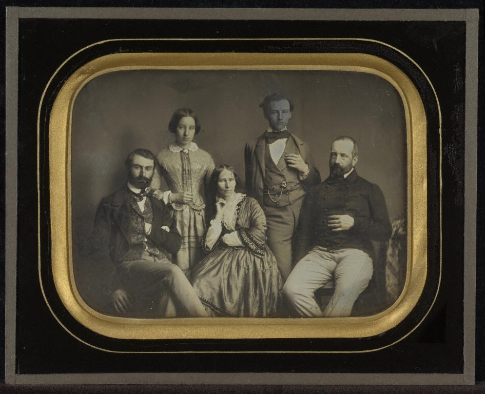 Jean-Gabriel Eynard's nephew and heir Charles Eynard married the daguerreotypist's adopted daughter, Sophie. They appear in this portrait with their children Gabriel, Hilda, and Féodor. Charles wrote biographies and, like other members of the family, was a talented amateur artist. Eynard's attempt to avoid the usual formality of group portraits of this period is reflected in his subjects' casual attitudes. Strangely enough, each figure is posed so that only a single hand is visible.