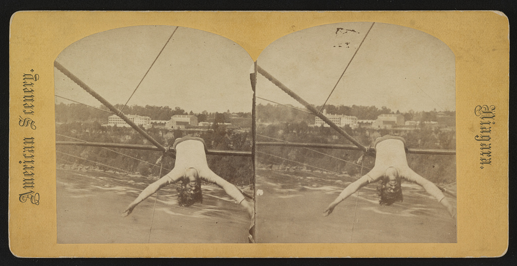 Photograph shows a man, likely the daredevil Blondin (1824-1897), crossing the Niagara River on a tightrope.