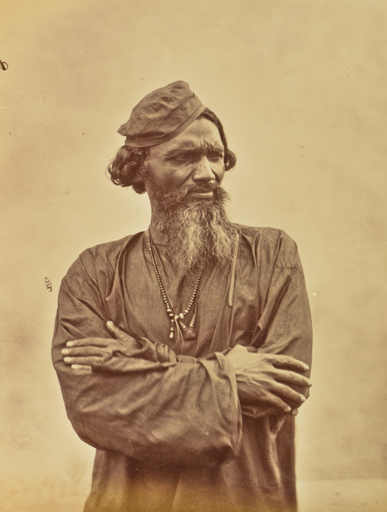 Portrait of a native man wearing traditional garments and a beaded necklace, with his arms crossed.