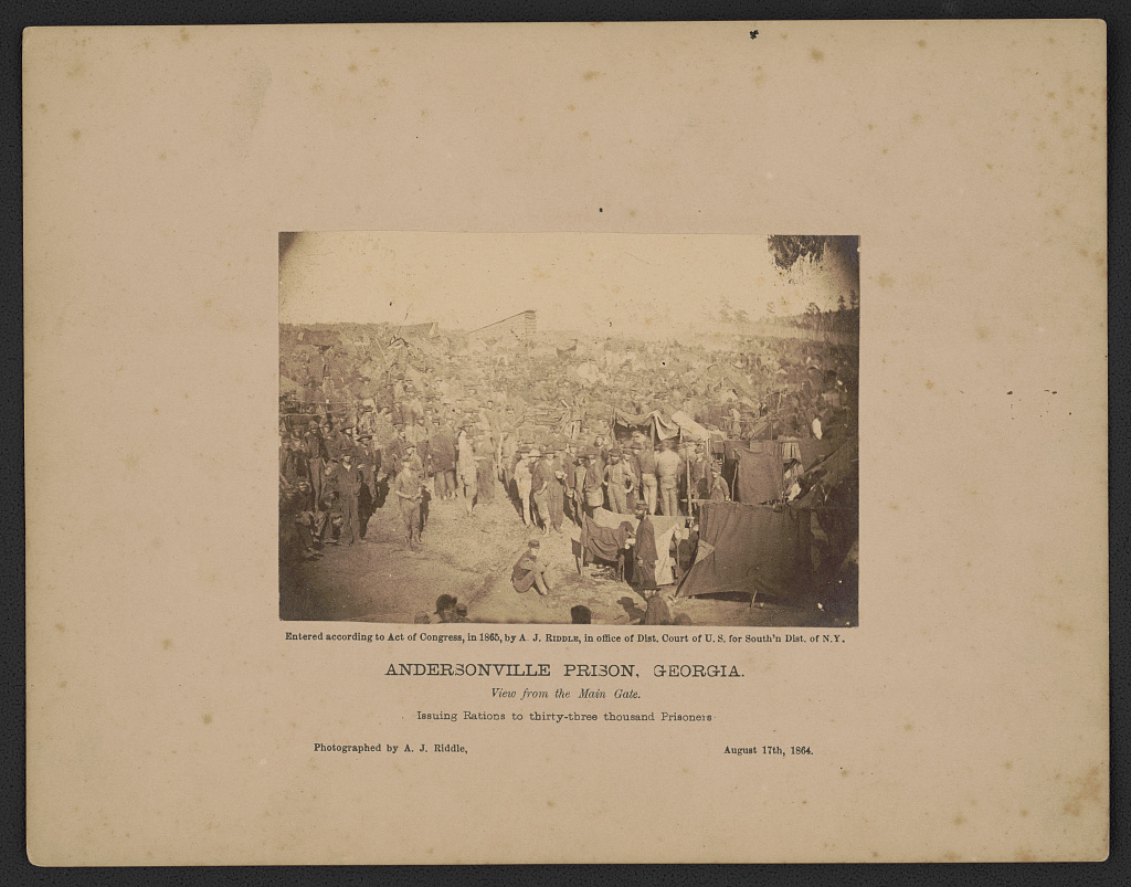 Photograph shows prisoners gathered for rations distribution in front of Confederate sutlers building and stockade in the distance (Source: Notes by Sergeant Warren L. Goss of Co. H, 2nd Massachusetts Heavy Artillery Regiment, prisoner who aided the photographer at Gilder Lehrman Institute of American History. Goss, Warren (fl. ca. 1864-1880). Descriptions of A. J. Riddle's photographs).