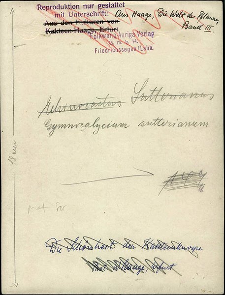 With various stamps and notations on the verso. One stamp is for the Folkwang-Auriga Verlag, of which Renger was the director of photography in this period. A pen inscription ascribes this to the book by the botanist Walther Haage, "Die Welt der Pflanze," published by Folkwang in 1930. The latin name of the plant is given in pencil. One of Haage's specialties was cacti. A slight variant of the photograph, with Renger-Patzsch ink stamp, was offered in the F. Tajan auction on 11/22/05, Lot 32.