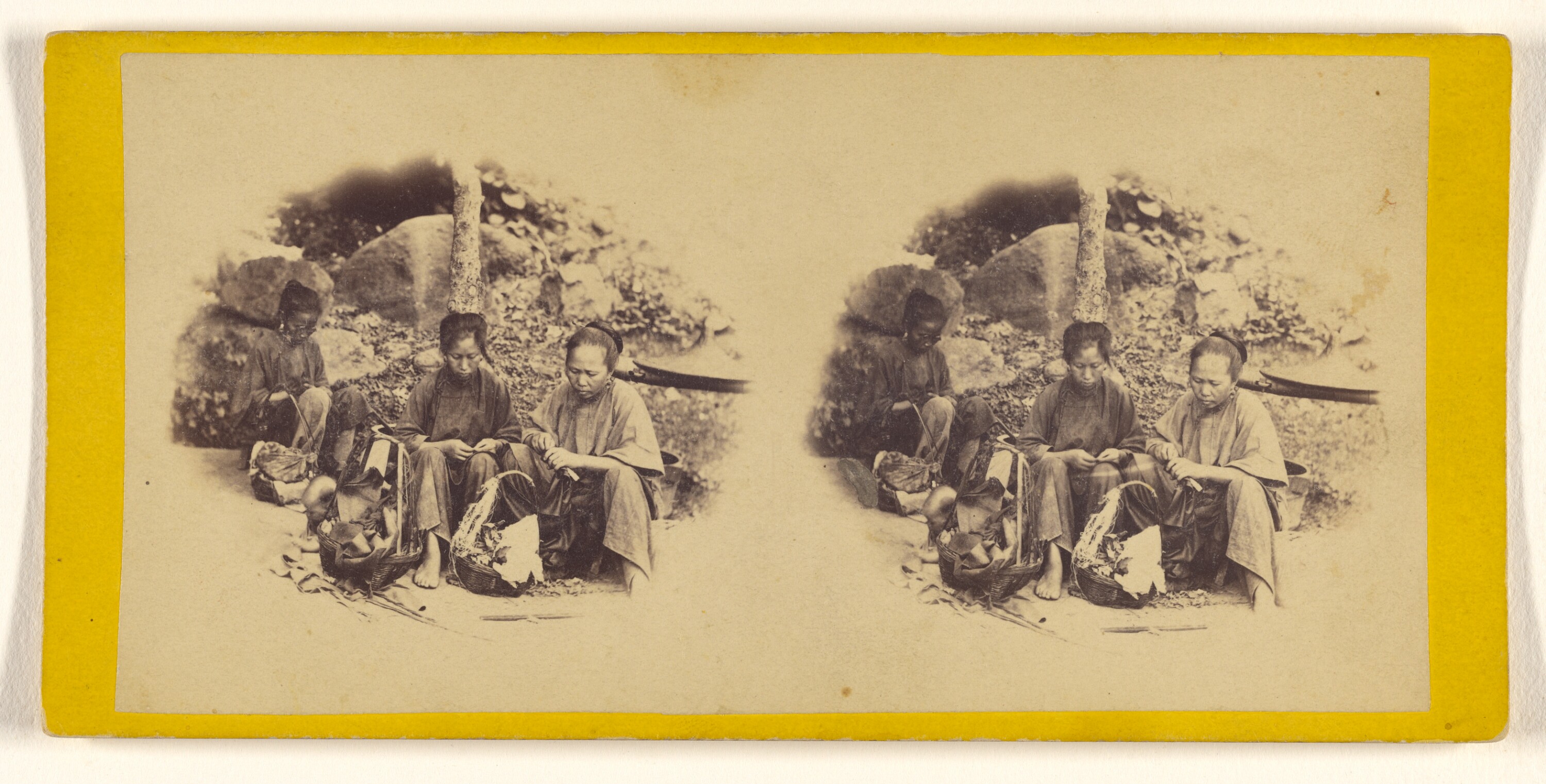 Poor Chinese Women mending Clothes in the Streets of Hong Kong, China.