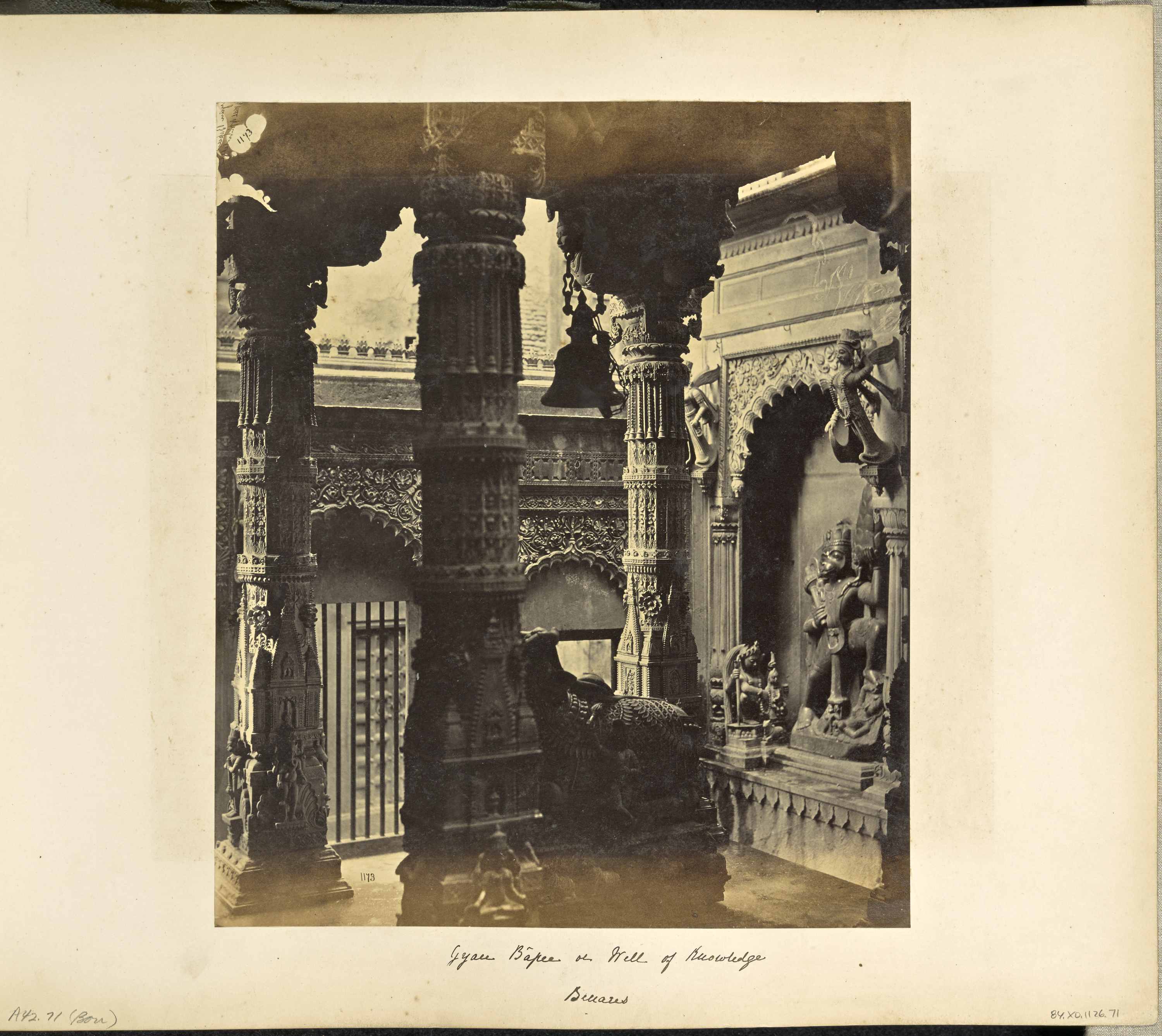 View of the Gyanvapi Well inside the mosque of the same name in Varanasi. Three ornately carved pillars stand in the foreground, in front of a carved statue beneath a recessed arch. A second, ornately decorated statue sits between two of the pillars, and a bell hangs from one of the pillars' capitals above it.