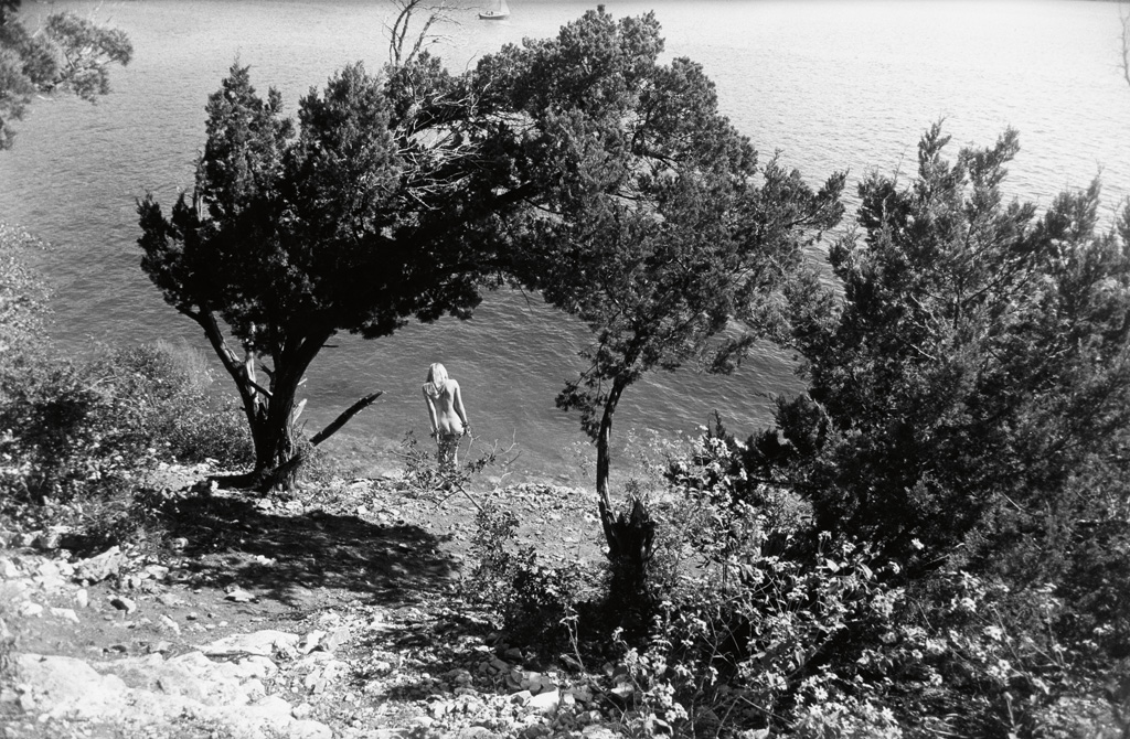 Woman disrobing on a lakeshore