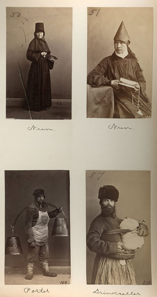 Album page showing four Russian occupationals, nun, nun, porter and ? seller
