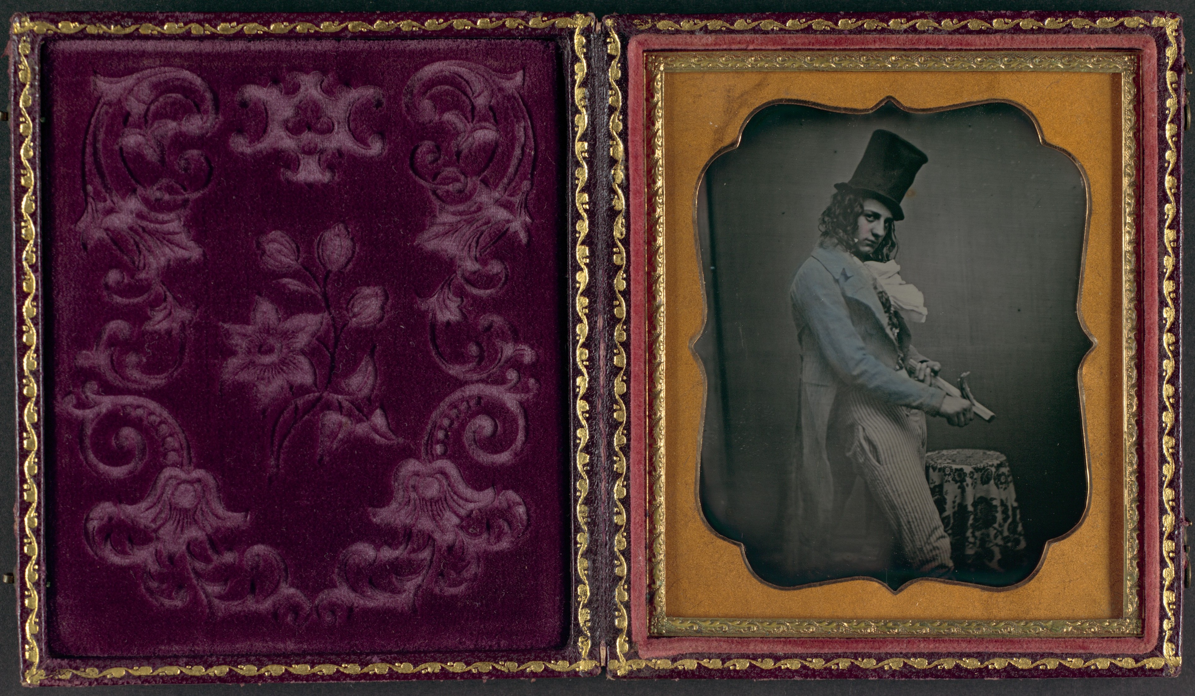 The "wily Yankee" was a popular mid-nineteenth-century stage character from American regional theater. With tricks of cunning and an exaggerated costume (top hat, wide striped pants), this stock player became the visual prototype for America's "Uncle Sam." The motif of the whittler relates to the character's role. Between acts, the Yankee remained on stage, whittled, and told parables. At times, he also flirted with both the women and men in the audience as he suggestively carved a stick at his crotch.