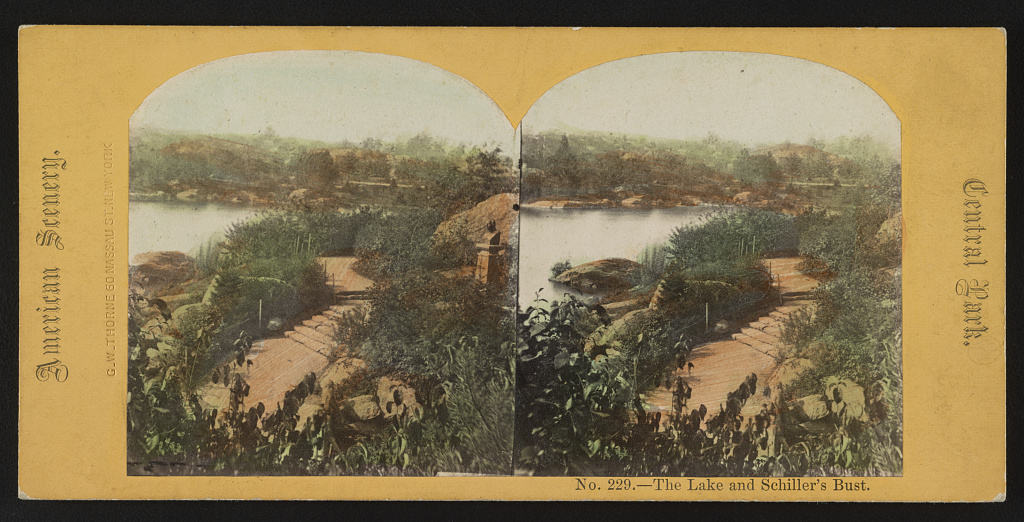Photograph shows a foot path in Central Park's ramble, left image includes the bust sculpture of Johann Christoph Friedrich Von Schiller (1759-1805), by Charles Ludwig Richter, New York City, New York.