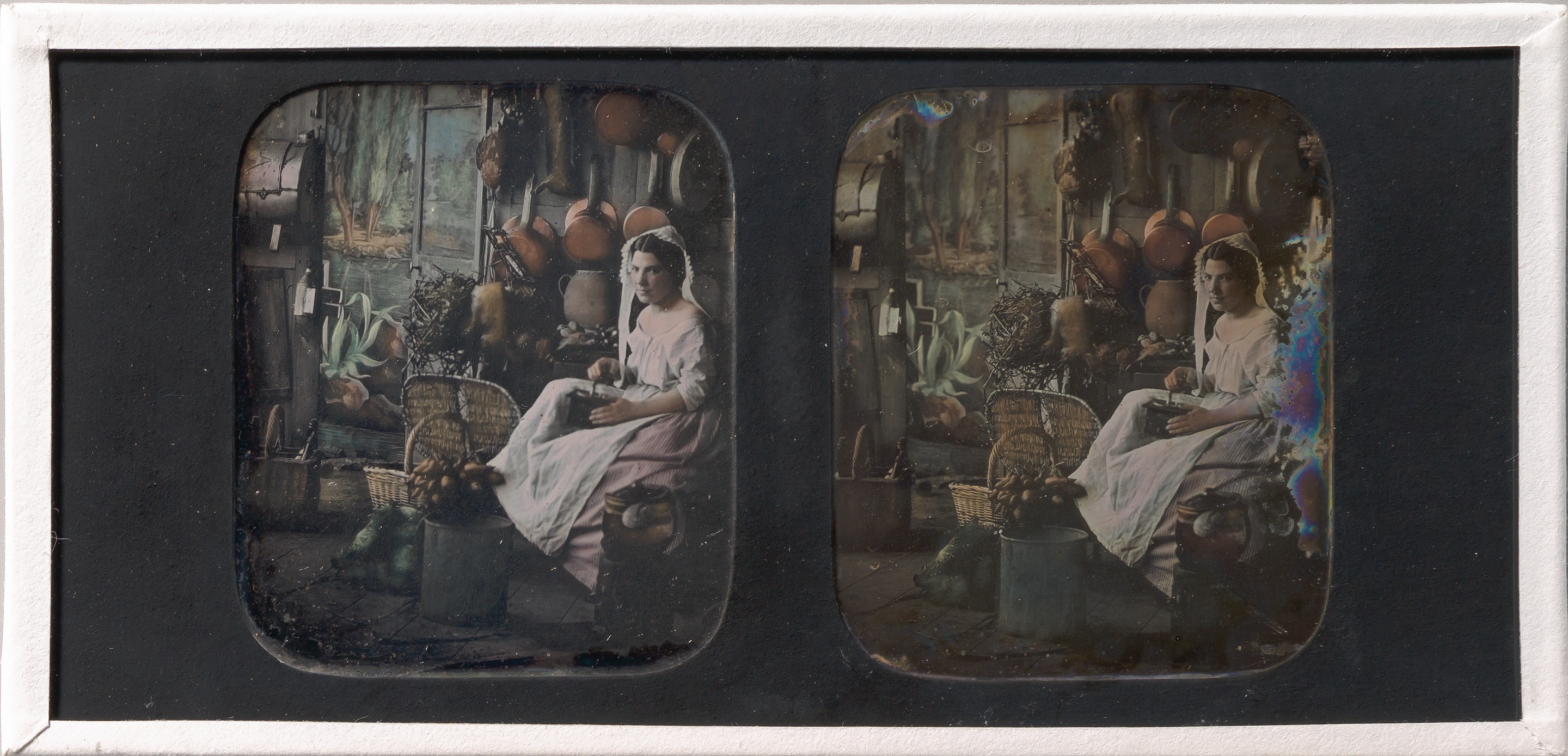 [Woman in Apron and Bonnet Grinding Coffee in Kitchen Setting]