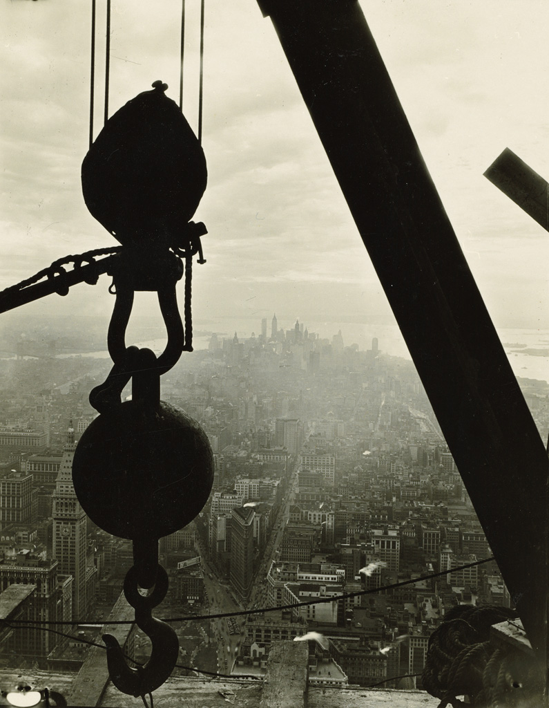Silhouetted crane hook (with lower Manhattan visible from the Empire State Building)