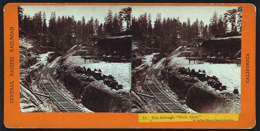 Alfred Hart 1865-1869 Cut through "Dixie Spur," 64 miles from Sacramento [Central Pacific Railroad, California. Scenes in the Sierra Nevada Mountains. No. 053]