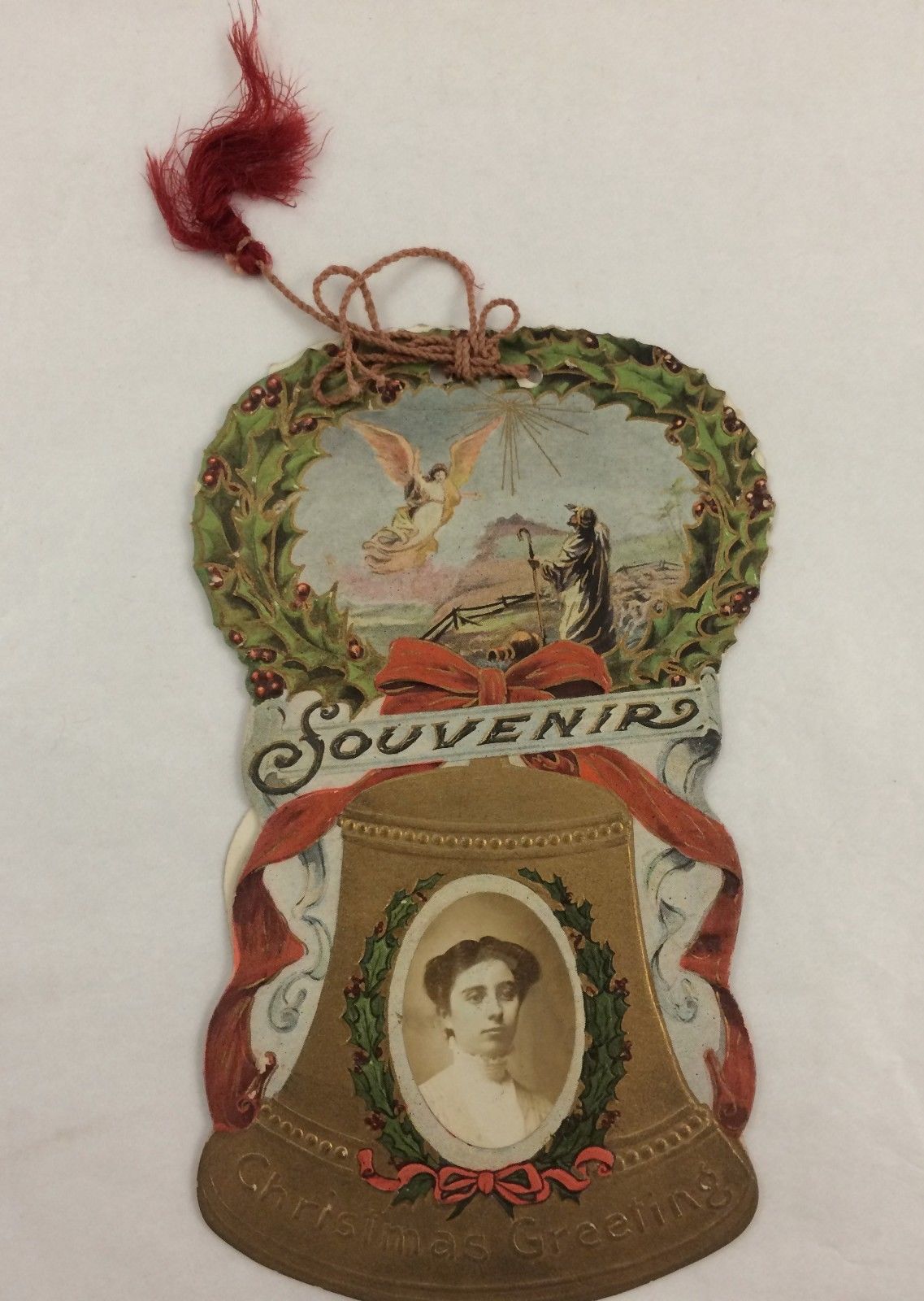 Die cut holly wreath around biblical scene at top and matron's photo in the gold school bell below.