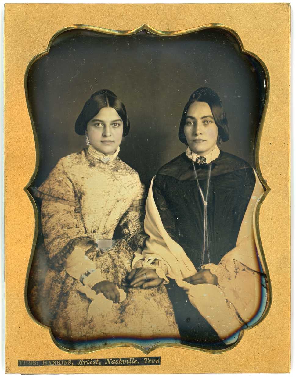 The one on the right is wearing a brooch at her neck showing a photograph of a young girl, probably a daguerreotype.