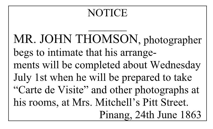 [Pinang Gazette] Photography - Mr. John Thomson, photographer begs to intimate…