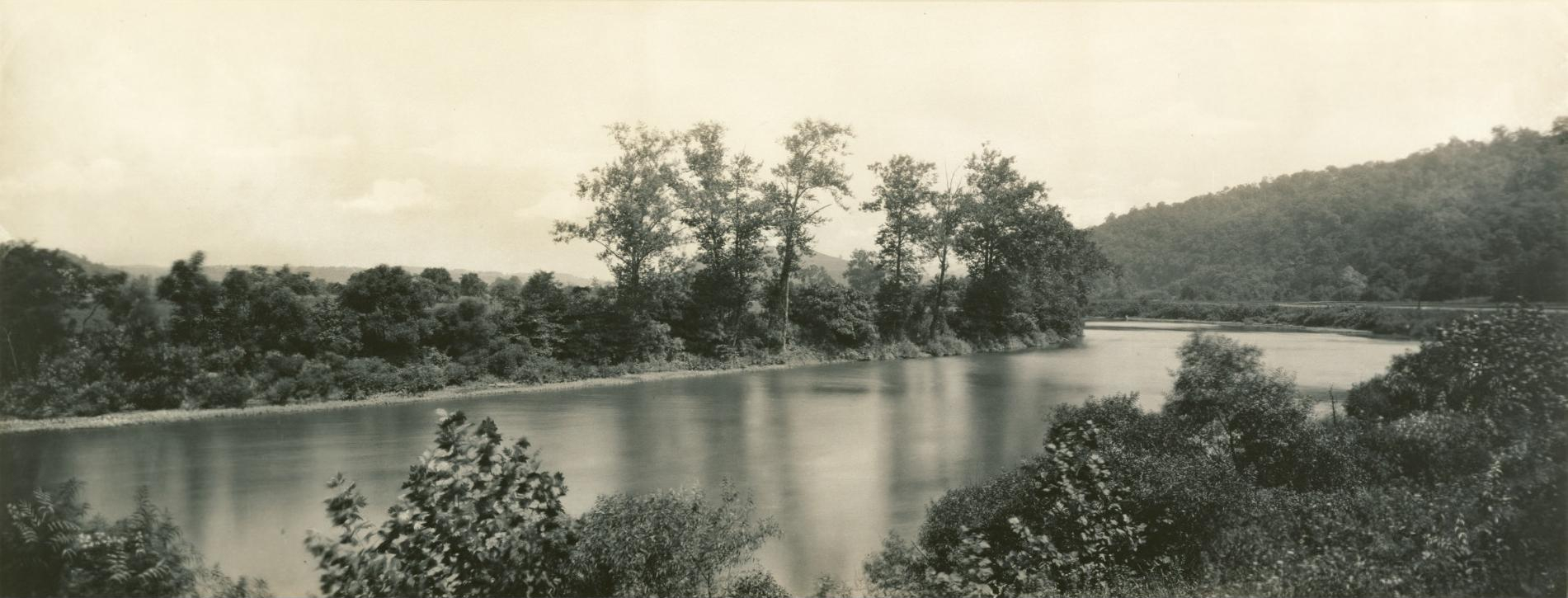 Assuming the view of a passenger aboard the Pennsylvania Railroad, William H. Rau made this panoramic photograph overlooking a bend in the Conemaugh River. Though the area appears untouched by humans, the tracks of the railroad are just visible at the far right-a suppressed detail within the pastoral landscape. As an official photographer for the Pennsylvania Railroad in the 1890s, Rau was specifically directed by the company to select interesting views. This attractive image of a glassy, meandering river could have served as a company advertisement.