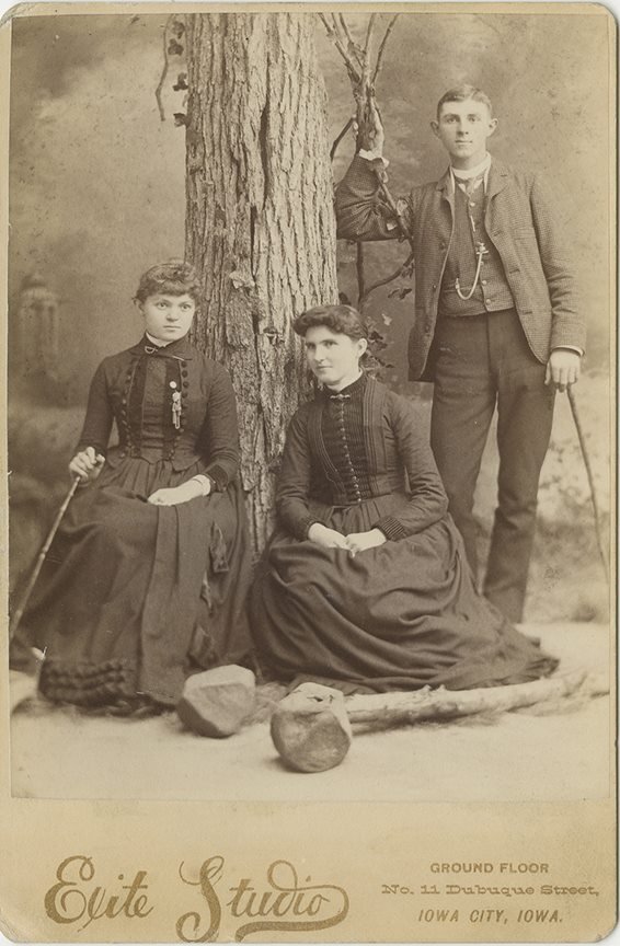 Studio portrait of two women and a man