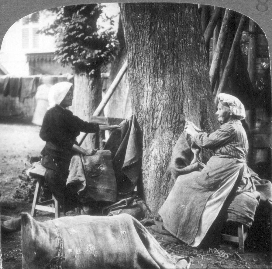 Quaint study of French dames making sandbags for the trenches. Nancy.
