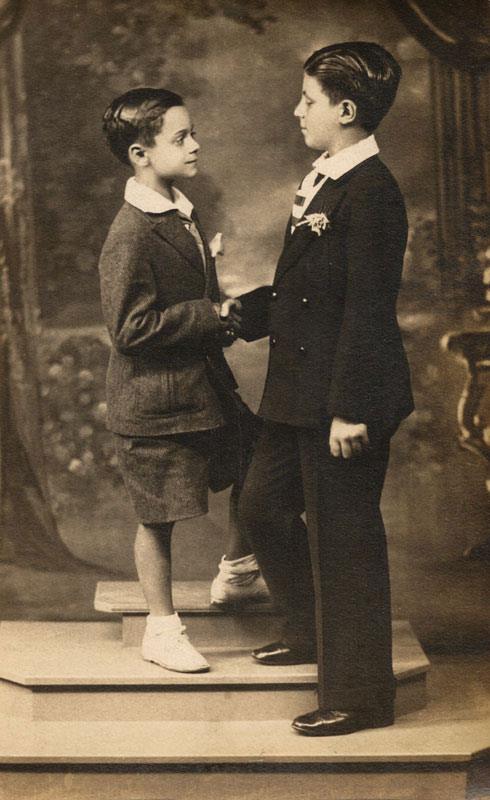 Studio portrait of two brothers shaking hands whilst standing on prop steps