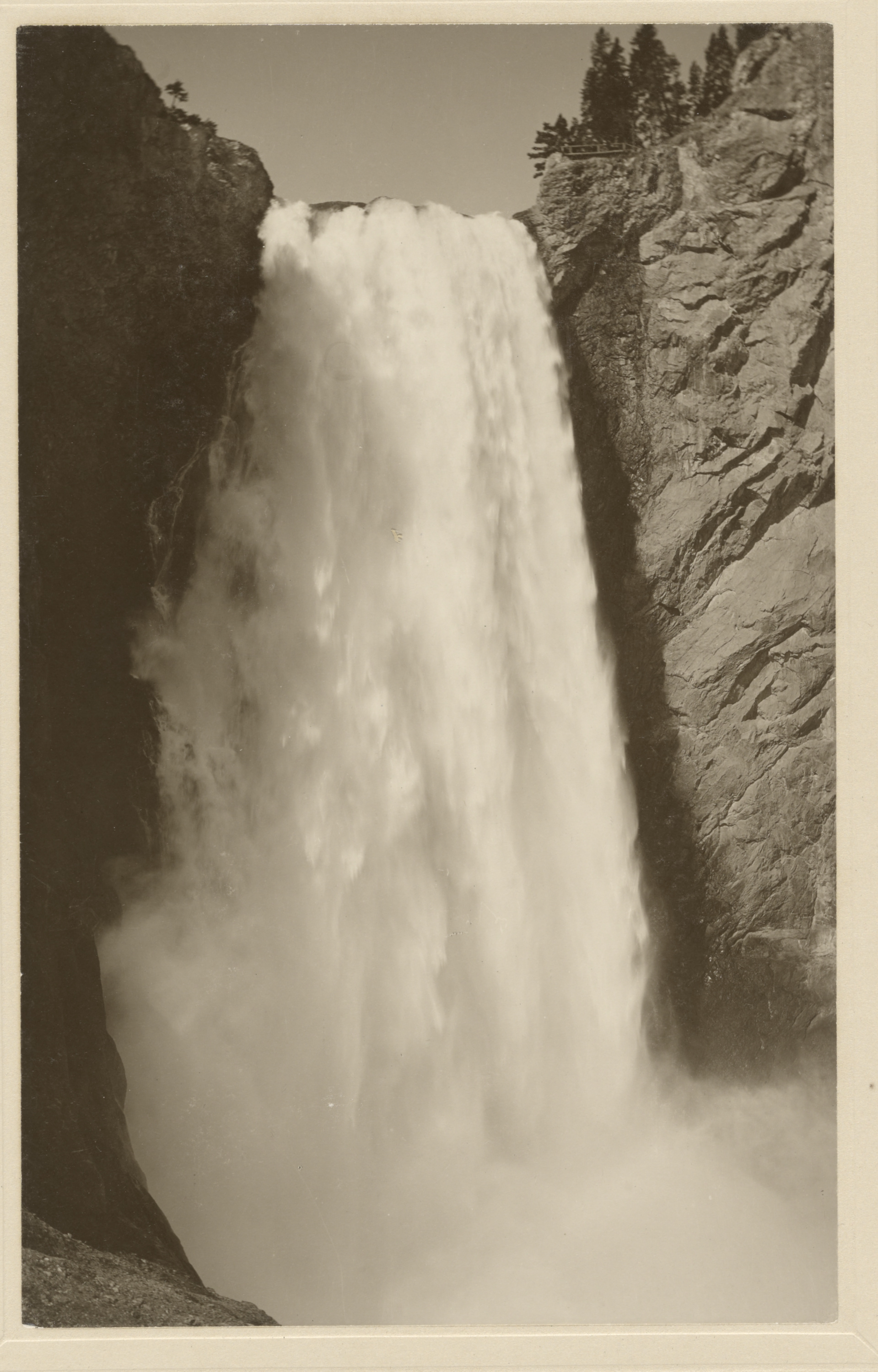 Rushing white waterfall spouting between two sheer rock cliff faces.