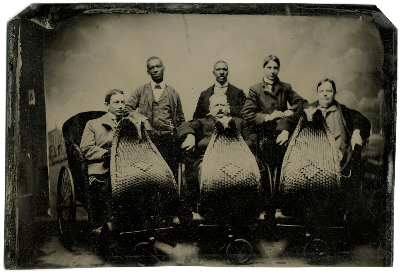Three men standing behind three men seated in wicker rolling boardwalk chairs