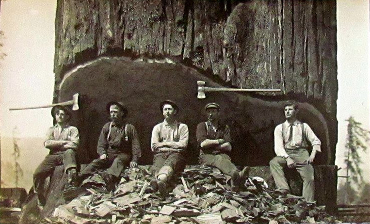 Five men pause from felling a tree