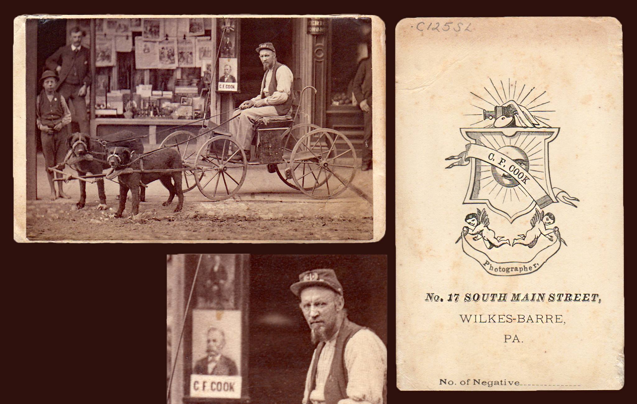 Dog drawn carriage in front of the photographic studio of C.F. Cook, Wilkes-Barre, PA